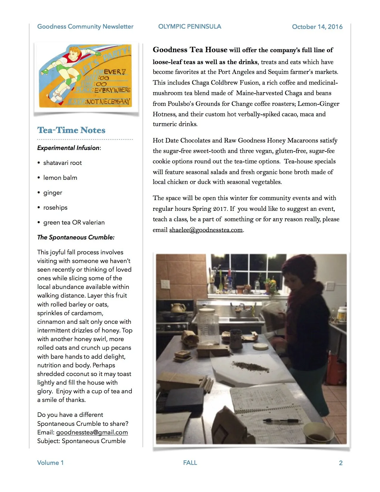 Along Highway 101 in Sequim, Goodness Tea House will have loose leaf-tea, chaga tea with cold brew coffee, gluten-free cookies, chocolates and light seasonal food. It will be a permanent, consistent version of the booths I have had the past two years at area farmer's markets and festivals. This space will also make it easier to have more herbs available bulk and to provide a greater variety of infusions, elixirs and tonics.